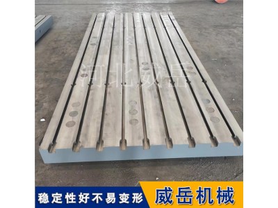 T型槽铸铁平台的T型槽主要用于固定工件或设备。T型槽的形状为T字形,沿平台工作面纵向或横向分布,槽内可放置T型螺栓,螺栓头部卡在T型槽的底部,螺杆伸出槽外,通过螺母将工件或设备紧固在平台上。这种固定方式能确保工件在加工、检验或装配过程中不会移动,保证操作的稳定性和精度。T型槽的尺寸和间距根据平台规格而定,可根据需要选择合适的T型螺栓配合使用。带有T型槽的平台在机械加工、装配等场景中应用广泛,能提高工件的装夹效率,简化固定工序,是平台实现多功能用途的重要结构设计。