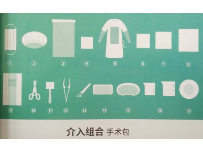 手术包配置:一次性使用医用口罩1个、一次性使用帽1个、器械盘套1条、擦手巾(40*40cm)2块、一次性使用手术衣(加强型)2件、一次性使用垫单3条、一次性使用吸水巾(60*75cm)1条、一次性使用中单1条、一次性使用手术洞巾(心血管单)1条、塑料止血钳1把、海面刷(弯)3把、塑料镊子1把、一次性手术刀1把、长方形塑料盘1个、弯盘2个、量杯(120ml、150ml)各1个、平底圆盘1个。
