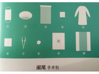 手术包配置:一次性使用医用口罩3个、一次性使用帽3个、器械盘套1条、擦手巾(40*40cm)3块、一次性使用手术衣(加强型)3件、吸水巾6块、镊子1把、医用棉球1包、一次性使用手术洞巾(阑尾手术单)1条、一次性使用包布1条。