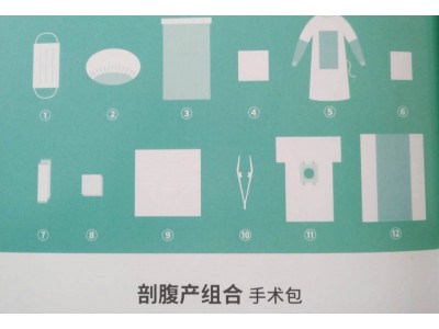 手术包配置:一次性使用医用口罩1个、一次性使用帽1个、器械盘套1条、擦手巾(40*40cm)4块、备胶料(10*50cm)4条、一次性使用手术衣(加强型)2件、手术巾2条、纱布块10片、婴儿包布2块、镊子1把、剖腹产单1条、一次性使用包布1条。
