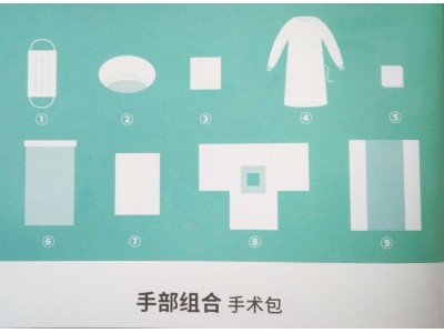 手术包配置:一次性使用医用口罩1个、一次性使用帽1个、器械盘套1条、擦手巾(40*40cm)4块、一次性使用手术衣2件、纱布块10片、一次性使用医用垫单(臀底单)1条、一次性使用手术洞巾(手部单)1条、一次性使用包布1条。