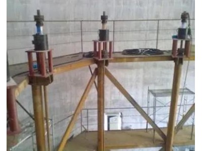 (3)液压提升设备的安装、就位液压提升设备可以分别安装、就位。当所有油路全部接通后,让千斤顶处于松卡状态,先进行全过程试验2^-3次(不加压),然后再进行额定油压试验,观察各油路系统有无泄漏等异常现象,同时检查液压控制柜工作是否正常。接着进行空载试验,检查液压顶的往复运动、提升杆的步进动作及上下卡头的卡紧性能是否可靠。发现不正常应作调整。一切正常后,就可将提升架底板与罐底板焊牢。至此,液压提升设备的安装、就位即完成。